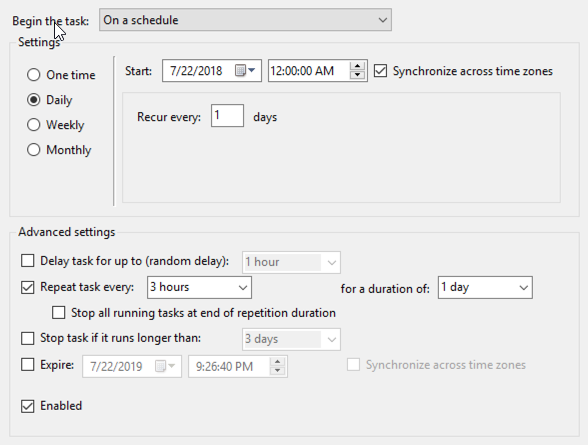 - Settings: Daily, Starting at 12:00AM, recurring every day