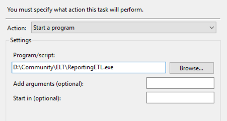- Program: [folder location of ETL service]\ReportingETL.exe